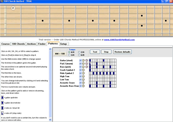 This being multimedia software, 100ChordsMethod requires your PC to have a decent - but certainly not fancy - soundcard. I appreciated the software's options of choosing different instruments, switching the sounds of the chosen instruments (e.g. from steel string guitar, to electric, etc.), hearing and playing along with any chord, in any position, and strumming at selected speeds to different programmed drumbeats.