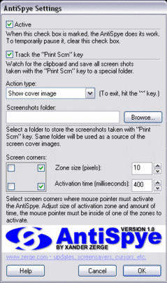 However, there are some times when spy may stand on your side of screen behind you. Sometimes it is safe, but sometimes you can work with important information that you do not want to be seen by anyone. The AntiSpye is an easy utility that will hide your screen from external eyes. No mouse clicks, no fingers configurations to press simultaneous key combination. Just move the mouse pointer to one of the screen corners and viola! Your screen will be hidden with blank window, screensaver or with the screenshot that you could make earlier. FEATURES * Three types of action: blank screen, cover image, screensaver * Built-in screenshot taking tracker * Hides the screen with mouse movement in one of the screen corners * Adjustable sensitivity zone size * Adjustable activation time Advertisement