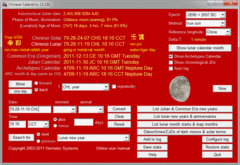The solar calendar consists of a series of seasonal years which are divided into 24 "solar terms". The lunar calendar consists of a series of years which are divided into 12 or 13 lunar months. A solar year always begins at the (northern) winter solstice. A lunar month always begins on the day of a dark moon. Chinese Calendrics is used to do the following: To convert between dates in the Chinese, Vietnamese and Japanese solar and lunar calendars and dates in the Common Era and Julian calendars. To calculate the date of New Year's Day in the Asian lunar calendars. To ascertain the Western dates of the starts of all lunar months in a year in the lunar calendar. To find leap months in the lunar calendar. To find the Western dates corresponding to Chinese, Vietnamese and Japanese anniversaries (e.g., birthdays). To move forward or backward from a given date (and time) either by a period such as a month or by a number of days. To calculate the phase of the Moon for any time within a 6000-year period. To search for the next or previous full moon, dark moon, lunar quarter, solar term or solstice or equinox of a certain type. To search for a solstice or an equinox in combination with a dark moon or a full moon. To search for the next or previous day, month or year with a certain element-animal correspondence (e.g., the next water-ox year or the next fire-dragon day). To find days for which the element-animal is the same for day, month and year. Advertisement