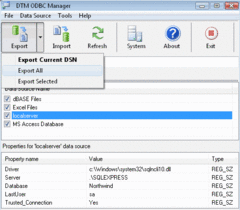 ODBC Manager is an indispensable tool for DBAs or developers who have to transfer data source definitions between computers and is a perfect addition to the system ODBC Administrator. The program allows you to audit local and remote data source definitions, remove DSNs and import definitions created on one of the computers on a remote system right from your workplace. To do it, "Remote Registry Service" must be running on the system you work with and it must have all necessary drivers installed. The program works both with system DSNs and with user DSNs. DTM ODBC Manager allows you to operate not only with a single DSN, but also to export or import all existing items or those selected in the list. Command line and GUI mode. Download your free copy right now! Advertisement