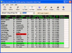 Dan Gordon is widely regarded as one of the three best handicappers in the sports world and has a winning record as a professional sports bettor for over two decades. His sports betting columns have appeared in the New York Daily News, San Francisco Examiner, Boston Herald, Log Angeles Herald Examiner, College and Pro Football Weekly and other newspapers and magazines and he served as handicapping consultant to Pete Axthelm of NBC, ESPN and Inside Sports Magazine for seven years. His latest book Beat the Sports Books - An insiderâs guide to betting the NFL is a seminal work in football betting. Betting the NFL effectively requires a great deal of data and effort. Dan Gordonâs NFL Handicapping Companion (DG-NFL) is designed to greatly ease the process of collecting, maintaining and manipulating data and applying the many necessary calculations. The ability to experiment with changes to the calculations and assumptions is also provided with instant recalculation of the tables for the entire season. As a result, calculations will take far less time and will likely be more accurate. Note: If you have not read Beat the Sports Books, the program can still be used. But, you will find it far easier and more valuable with the book. A brief outline of DG-NFL: Automatic weekly update to 2005 scores and handicapping data via the Internet. This includes phony wins, phony losses, sloppy wins, home advantage adjustments and mid-season team rankings. Auto weekly download of Danâs subjective adjustments. Automatic calculation of number power ratings, letter power ratings, due ups/downs, projected lines and win percentages. Automatically makes weekly adjustments according to 13 rules from Beat the Sports Book. Enormous user configurability. User can create his own tables, adjust formulas, change power numbers, letters, grades, edges, selectively activate rules, modify the effect of rules, add adjustments and the entire season is instantly recalculated