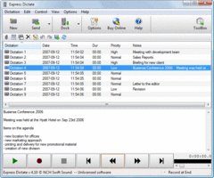 Features ~ Digital audio recording with superb signal processing quality (32 bit DSPs are used). ~ Record to wav, mp3 or dct formats (only dct supports encryption, sender information and notes). ~ Automatic non destructive record editing with multiple record modes including record-insert, record-overwrite and record-at-end. ~ Voice activated recording so long silences in dictation are not recorded. ~ Assign priority to individual dictations. ~ Ability to prompt for patient or file data before recording starts and supports the VIS Laser Barcode Scanner. ~ Send recordings directly to a typist immediately by email, over a computer network or via FTP or save to your hard drive. ~ Supports recording encryption if you are required to secure patient or client data for transmission over the internet (HIPAA compliant). ~ Ability to 'dock' normal analog and digital handheld dictation recorders so even if you don't record with Express Dictate you can still use it to transmit recordings to your typist via email. ~ Attach additional files to the recordings or type in notes for your typist or for the record. ~ Ability to recover sent dictations. ~ View "Sent Work Progress" and backup sent dictations to hard drive or CD. ~ Audio compression to reduce file and transmission size. Codecs supported include PCM, wav, mp3, gsm and many more. ~ Can be controlled by system-wide hot keys (so you can record while working in other screens). Advertisement