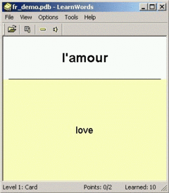 For each word of dictionary it is necessary to execute a sequence of six basic exercises (Card, Mosaic, Select translation, Guess translation, Select word, Writing). Exercises change automatically as you reach a certain level of points. Points are added for the correct answer and are lost for the wrong answer. Features: - transcription and pronunciation of words - games and amazing forms of levels of study - automoving of words (like slide-show) - repeating of words (system of scheduling repetitions) - creation and editing of dictionaries built-in "Editor of words", comment to the dictionary - export/import, sorting and more in the free editor 'LearnWords Editor' - virtual keyboard provides fast input of national symbols - adaptation of process of training (ball system of an estimation, penalty for the incorrect answer) - information panel of process of study for each word (number of a levels, name of exercises, typed points, percent of learned words) - adjustment of parameters of work LearnWords "under itself " and abilities to storing - interface on english, russian, czech, german and polish languages - free dictionaries: active lexicon, phrase and grammar, thematic - see on www.learnwords.com - more 20 languages: English, German, French, Spanish, Russian and others. Advertisement