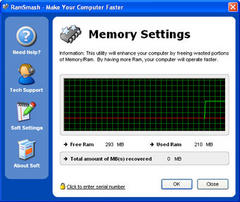 RamSmash is a tool for all which allows you to maintain and manage memory the right way. No modifications to your hardware are made and all adjustments and settings are done in an easy to use interface that a child could use. Most other Ram/memory modifiers promise that they work while you notice no difference at all in performance. RamSmash on the other hand has been tried and tested and proven to work. Are you tired of program crashes or low memory warnings? Or you notice your computer performance slowly degrades after a period of time? RamSmash not only fixes these problems from occurring it also enhances your computers performance. Keep Windows running longer by using RamSmash! No longer do you have to reboot your computer due to low memory warnings, you choose the amount of memory your computer maintains and RamSmash releases wasted memory and returns it back to you. RamSmash will super charge your computers memory.