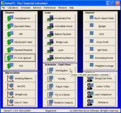 Support for: extra and skipped payments or deposits; Rule-of-78's; Canadian type loans; APR disclosure statements; evaluation of loan acceleration scenarios. Payment & compounding periods may be independently set. 10 payment periods: daily, weekly, biweekly, twice monthly, every 4 weeks, monthly, bimonthly, quarterly, semiannually & annually. Additionally, there is support for simple interest and continuous compounding. There is an amortization schedule as well as annuity, future value, present value and rental income schedules. Cash flow amounts & interest rates may be changed over a schedule's term. SolveIT! features a set of Financial Advisors. These are "wizard like" calculators which take the user through a series of questions. Once the questions are answered, a text answer is produced which provides advice on the best course of action to follow. There are four advisors: Break Even Point, Lease vs. Finance, Loan Comparison and Refinance. The Budget Calculator will produce 12 monthly projected and/or actual budgets. Annual cash flow statements can be prepared. The user can change the category descriptions to meet their needs. The Net Worth calculator produces a personalized net worth statement. Two popular calculators are the Payment Required Calculator and the Affordable House Calculator. The Affordable House looks at cash on hand, income and projected expenses as well as the percentage of income to be allocate toward housing. After considering all these variables, it then calculates an affordable price. Features extensive online help. All calculators use an intuitive, fill-in-the blank interface. Answer a series of questions & click on 'Calc'. There never is any need for programming. Advertisement