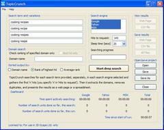 - have a *duplicate-free list* of domains of companies in your line of business - easily *check your own website's position* on the three main search engines when up to four sets of keywords or phrases are used - keep *tabs on your competitors' positions* for the same (or other) keyword sets . . . and all this in the background, while you get on with something else. *TopicCrunch can do that for you*. And that's not all . . . - often you can go deeper than 1,000 results in a single run - you can pull out the results in a hyperlinked web page - choose the sequence for the results: Domain name, best hit or average rank - or, if you like, analyze the results in a spreadsheet - it provides an easy-to-use, comprehensive "OR" facility that lets you search on up to four variations of your search phrase or keyword -- good for plurals and common mis-spellings; - it has fast or detailed modes for single-domain checks - it has search-engine-friendly sleep periods Do if you want to answer the question "On the Web, who is selling ..." or "Which sites have information about ..." or even "How is my web site doing in the search engine rankings with my chosen keywords?", TopicCrunch needs serious consideration. Topicscape is a tool for a special type of web searching that will be useful to all web users, and especially to market researchers and to web designers concerned about Search Engine Optimization (SEO). TopicCrunch lets you choose how deep you want to dig, down to the search engine maximum of 1,000 hits. In fact because of the 4 search phrases, it can often let you go deeper than 1000 hits in a single TopicCrunch run. Advertisement