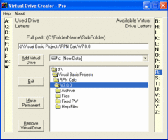 Create Virtual Drives from long paths, it's easy! Type the full path or (even easier) browse to the path via the Drive and Folder Lists. Choose a drive letter from the "Available Virtual Drive Letters" list and Click [Add Virtual Drive] to create the Virtual Drive, or Double Click the letter to create the Virtual Drive. It's just as easy to remove a Virtual Drive, Double Click the letter you want removed as a Virtual Drive or Click the letter and then Click [Remove Virtual Drive]. Make CD-ROMs obsolete: Copy the contents of a CD-ROM to a folder, not the root directory, on your Hard Drive. Make that folder a Virtual Drive (see paragraph above), then install the Virtual CD from the Virtual Drive letter. Click Start, Run and in the space provided type L:setup or L:install (substitute your Virtual Drive letter for L and see the documentation that came with your CD-ROM for the proper installation command). Now every time you need to access the CD you can use the Virtual CD from your hard drive. Be sure to make note of the Virtual Drive letter you used to create the Virtual CD, when you reboot your computer you will need to re-create the Virtual Drive using the same letter. (With the Pro Version of Virtual Drive Creator you can make your Virtual Drives Permanent!)
